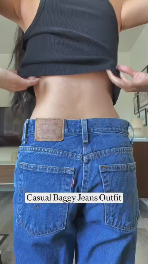 This outfit is a classic and effortlessly stylish combination. The mid-blue denim jeans offer a timeless, versatile look with a relaxed yet structured fit, making them perfect for casual outings or everyday wear. Paired with a black tank top, the outfit exudes a sleek and modern vibe, balancing simplicity with a touch of edge.